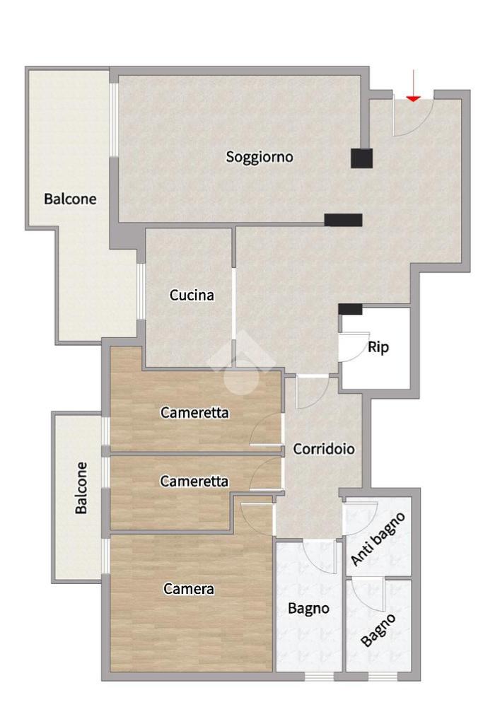 Completa la zona giorno un comodo ripostiglio. La zona notte è composta da una camera matrimoniale, due camerette e due bagni finestrati, uno dei quali con antibagno adibito a LAVANDERIA.