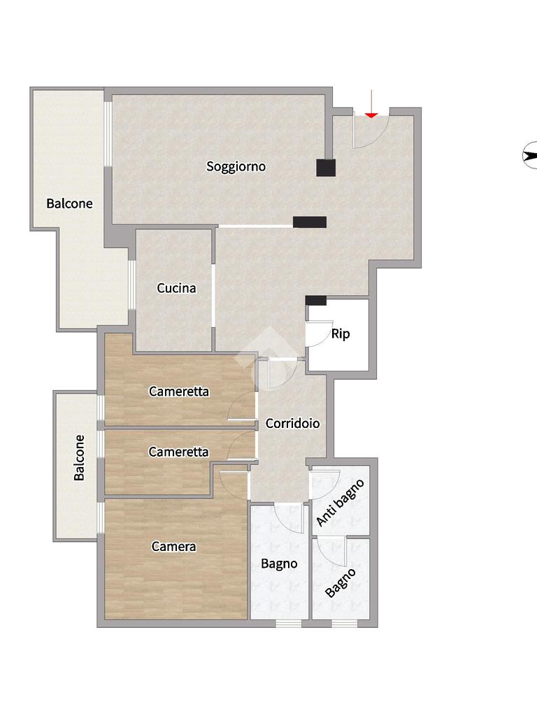 L’ingresso accoglie in un ampio disimpegno che conduce sia al luminoso soggiorno, con affaccio su un BALCONE TERRAZZATO, sia alla cucina abitabile, anch’essa con accesso diretto allo spazio esterno, ideale per colazioni e momenti di relax.