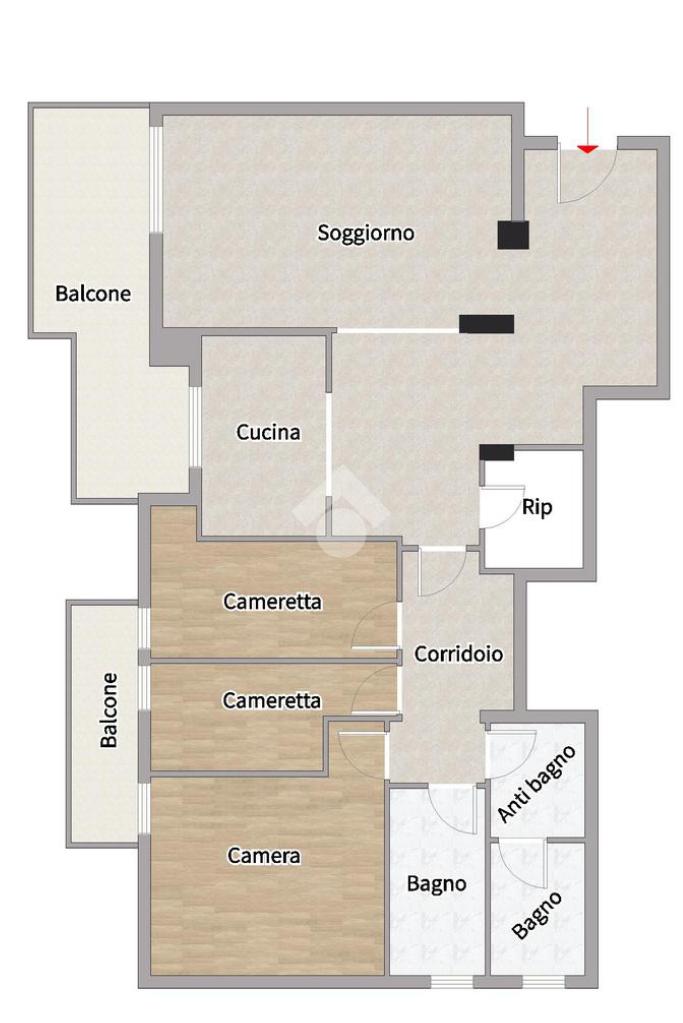 Completa la zona giorno un comodo ripostiglio. La zona notte è composta da una camera matrimoniale, due camerette e due bagni finestrati, uno dei quali con antibagno adibito a LAVANDERIA.