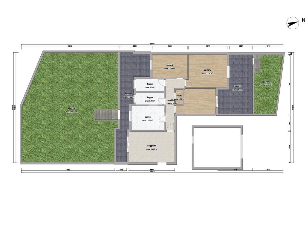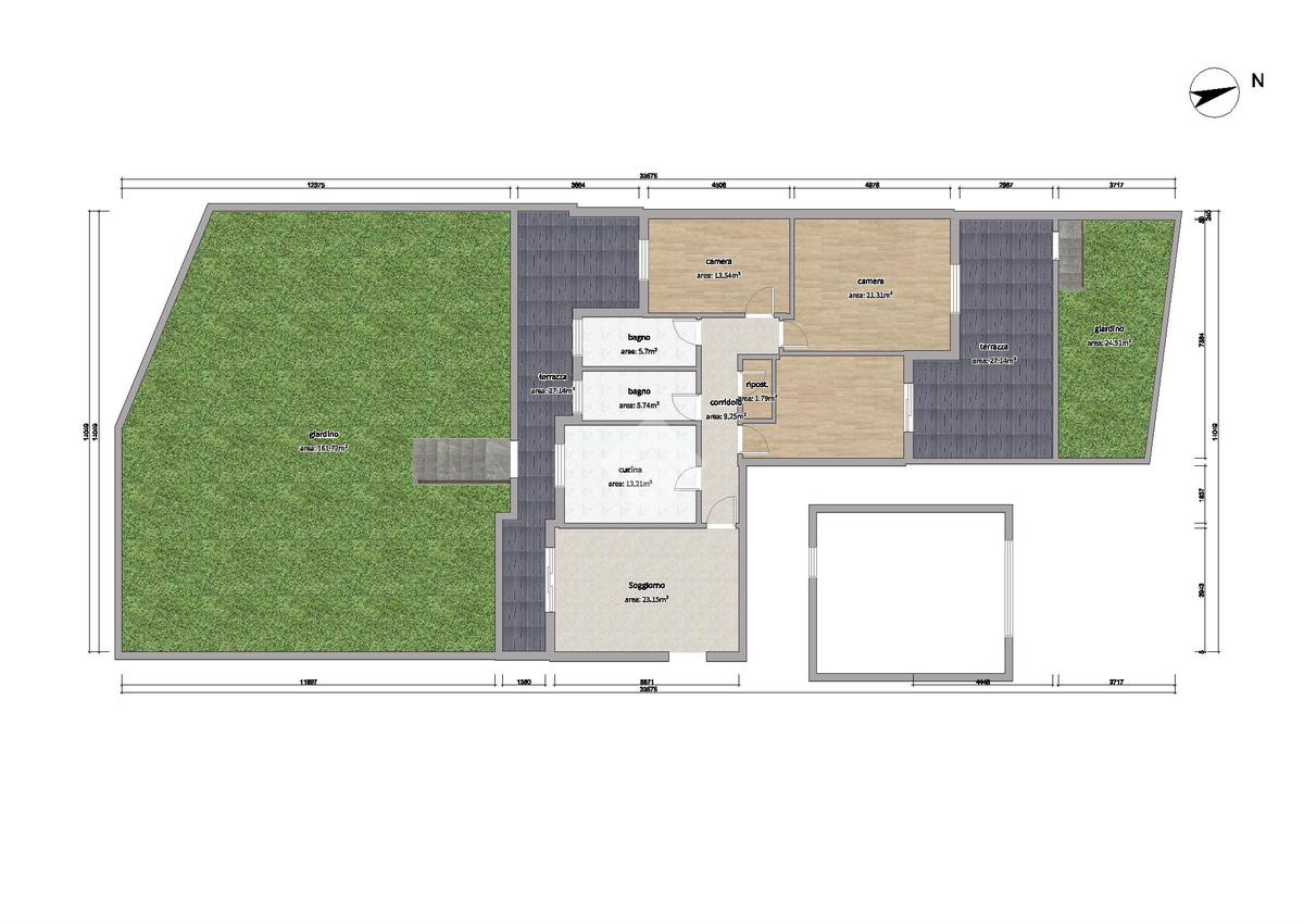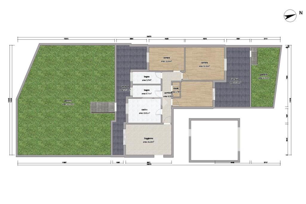 Proseguendo troviamo una cucina abitabile, anch’essa con affaccio sul balcone terrazzato, che crea una naturale continuità tra interno ed esterno. La zona notte è composta da tre camere da letto, di cui una con accesso diretto a un grande terrazzo collegato al secondo giardino, offrendo così una doppia area verde esclusiva, perfetta per famiglie, per chi ha animali o per chi desidera vivere appieno gli spazi all’aperto. Completano l’immobile due bagni (di cui uno con vasca e l'altro con doccia) e un comodo ripostiglio.